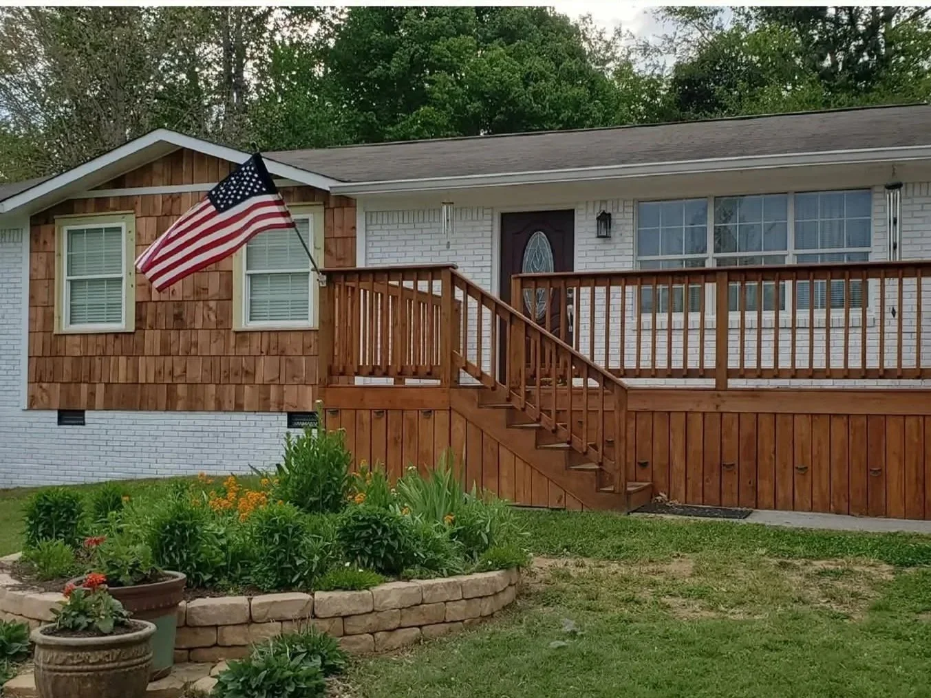 Added cedar shake siding, stained siding and porch, painted brick